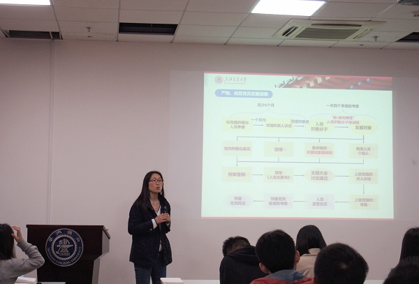 古莉首先从中国共产党的发展介绍了“入党介绍人”制度,包括如何确定入党积极分子培养联系人和入党介绍人,培养联系人、入党介绍人的主要任务和工作异同。她讲到,培养联系人需要了解入党积极分子各方面的情况,做好培养教育工作,引导积极分子端正入党动机,并及时向党支部汇报积极分子情况,严格把关入党积极分子每个季度的思想汇报,指导积极分子填写材料。入党介绍人肩负着光荣的政治责任,需要对入党流程有清晰的了解,不忘初心,严格把关。
