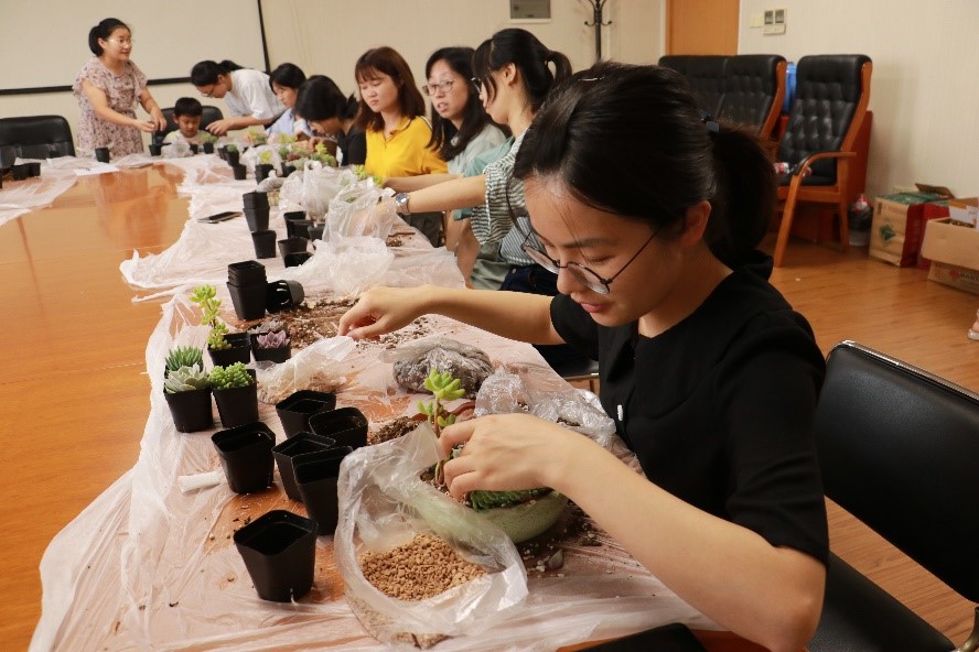 为舒缓学院女性教职工心理压力,点缀办公工位环境,7月24日, “相约木兰,细赏微观”桌面盆栽制作活动在木兰楼十楼举办。活动吸引六十余名女性教职工报名参与。院工会主席刘铸永出席本次活动,活动由妇女委员曹嘉怡主持。