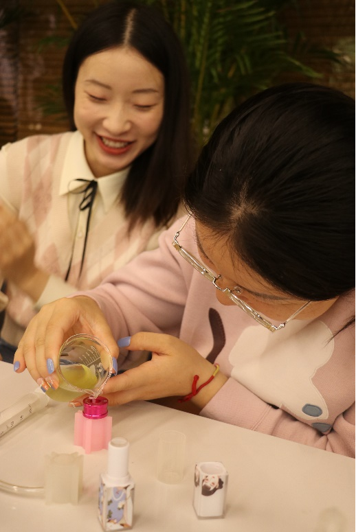 女教职工们沉浸在精油的神奇世界中,亲手实践,经过加热、滴入精油,搅拌,铸模,脱模等过程,见证了芳香诱人的唇膏的诞生。大家在老师的指导下精心雕琢着作品,在芬芳的体验中了解许多精油的相关知识,既体验了手工制作的喜悦,也让大家瞬间放松了身心。
