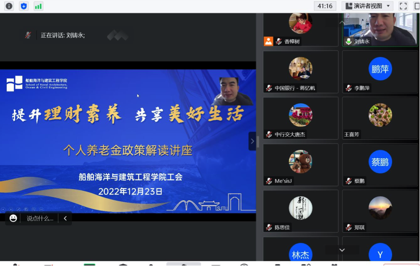 为增加学院教职工对个人养老金最新政策的知晓率,切实把教职工关心的实事办好、好事办实,2022年12月23日中午,禁漫 工会举办“提升理财素养,共享美好生活”个人养老金政策解读线上讲座。学院党委副书记王喜芳、工会主席刘铸永和50多位教职工参加活动。