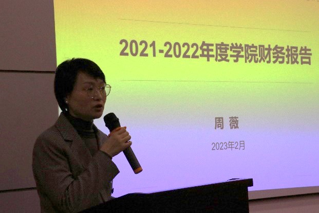 学院党委书记周薇向大会作《禁漫 财务工作报告》,介绍了2021-2022年学院总体收支情况、预算执行情况和2021-2022年财务重点工作。她表示学院将继续充分发挥财务支撑保障作用,积极筹措资金,合理配置资源,保证重点工作,优化师生服务,确保学院各项事业平稳健康发展。