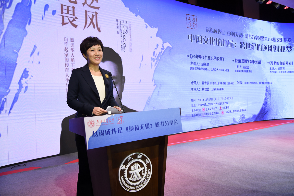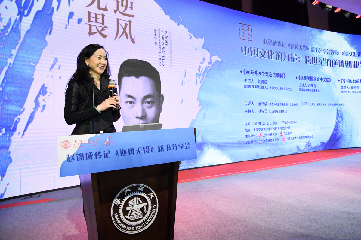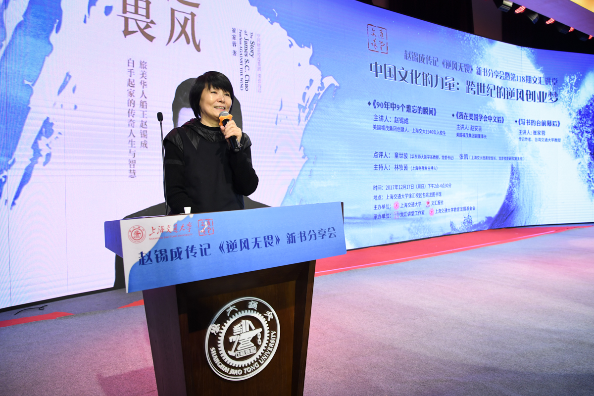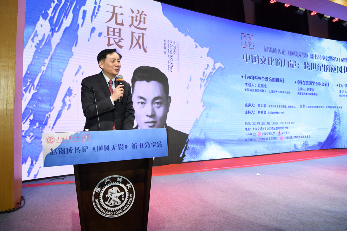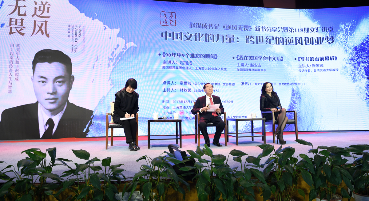 丁酉岁末,暖阳融融,游子归家,思源不辍。12月17日,古朴清幽的徐汇校区包兆龙图书馆演讲厅迎来了著名校友、旅美华人船王、福茂集团董事长赵锡成学长,六女儿、福茂集团副董事长赵安吉女士,传记作者、台湾交通大学教授崔家蓉女士一行,做客文汇讲堂,与母校师生及广大读者分享人生经历,共话家国情怀。市人大常委会副主任、校党委书记姜斯宪,党委常委、副校长张安胜表达了全校师生对赵学长及亲友一行的热烈欢迎。市政协对外友好委员会、市侨办、市公共外交协会、市海峡两岸交流促进会、市台办及高校代表出席新书发布会。本次活动由禁漫 、文汇报社联合主办。上海电视台资深主持人林牧茵主持活动。