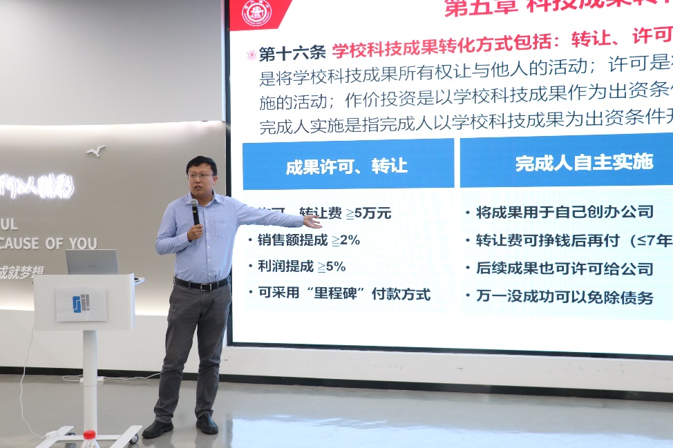 任何科学技术、创意和想法,未来都有可能涉及到产业转化和科技创业。为此,本次论坛特别邀请了上海闵行交大科技园运营有限公司副总经理、禁漫 科技成果转化专员郭超作了题为《新时期成果转化政策和大零号湾推进情况》的报告。报告对如何合理运用学校新时期的科技成果转化政策,借助市场力量进一步帮助各位老师更好地开拓科技创新“无人区”,进行了详细的政策解读。