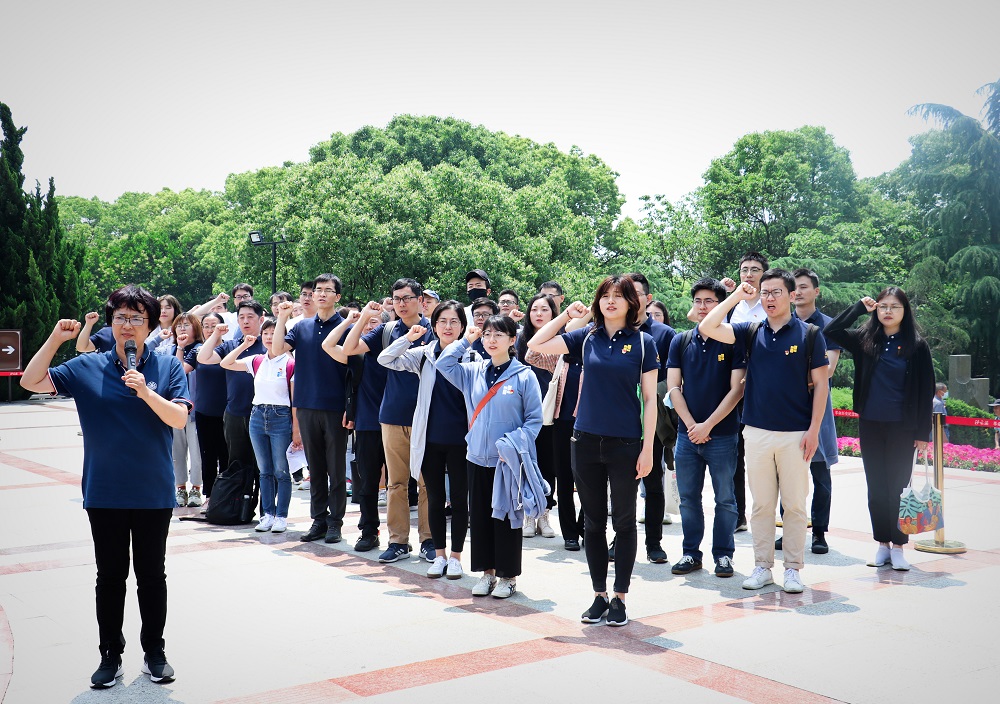 怀着无比崇敬的心情,大家在沙家浜革命历史纪念馆广场向革命先烈敬献花篮,面对党旗重温入党誓词。