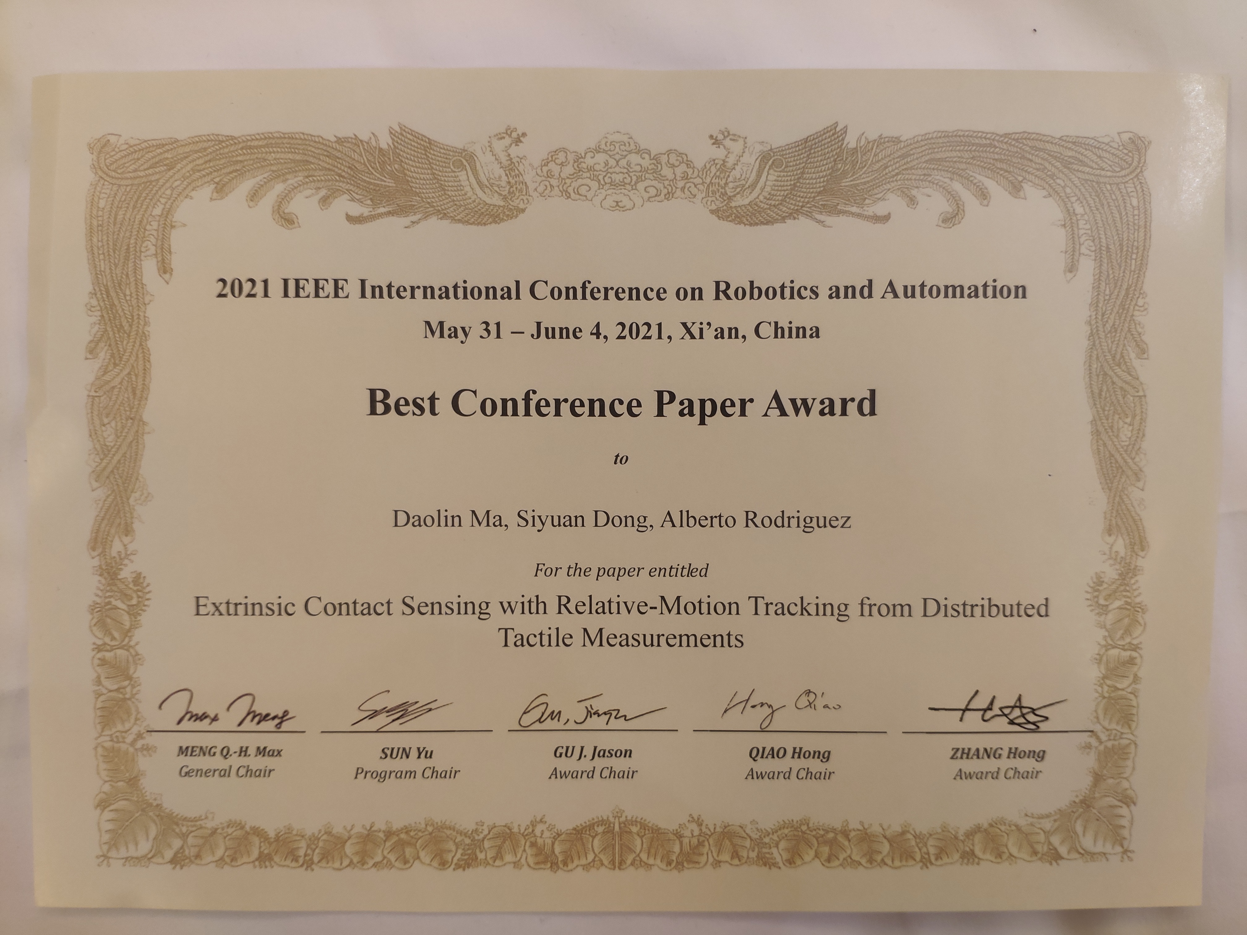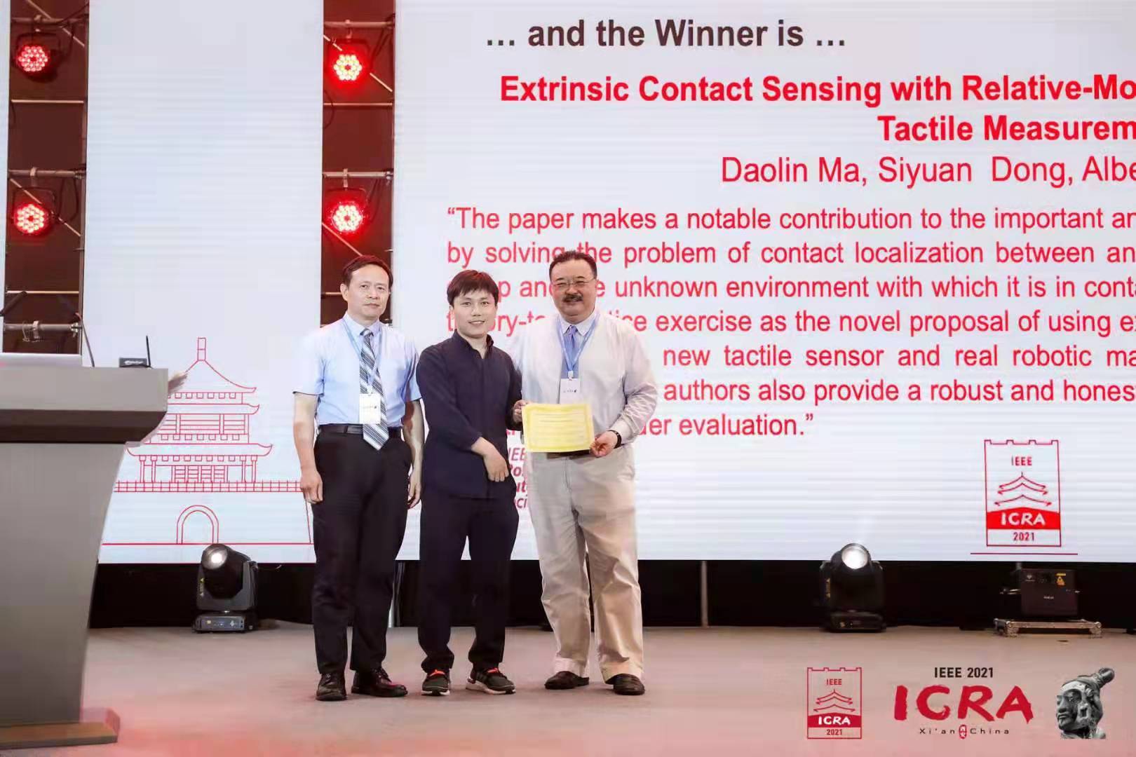 此次马道林副教授的获奖论文题为: “基于触觉测量的相对运动跟踪和外部接触感知” (Extrinsic Contact Sensing with Relative-Motion Tracking from Distributed Tactile Measurements)。 评奖委员会认为:“The paper makes a notable contribution to the important and re-emerging field of tactile perception by solving the problem of contact localization between an unknown held by an imprecise grasp and the unknown environment with which it is in contact. This paper represents an excellent theory-to-practice exercise as the novel proposal of using extrinsic tactile array data to infer contact is verified with a new tactile sensor and real robotic manipulation in a simplified, but realistic environment. The authors also provide a robust and honest discussion of results, both positive and negative, for reader evaluation.”