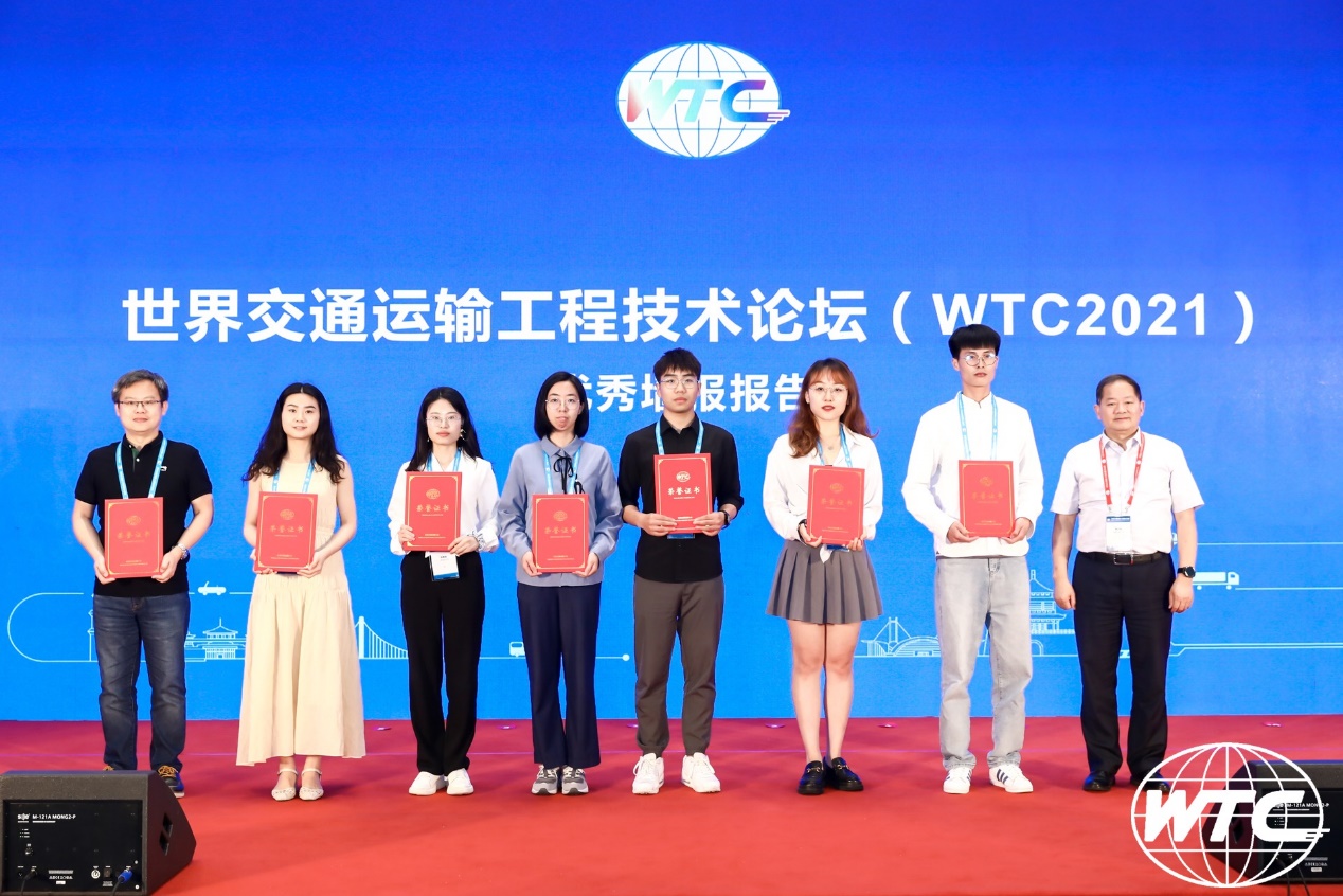 除了现场的演讲环节,本次WTC会议还设有优秀墙报报告评选活动,在800多份墙报中遴选出5%的优秀作品。经过激烈的角逐,交通系2019级研究生王梓烨同学(导师:何红弟副教授)和2020级研究生王壮壮同学(导师:汪涛助理研究员)提交的墙报作品获优秀墙报奖,并出席了世界交通运输工程技术论坛(WTC2021)优秀墙报报告的颁奖仪式。