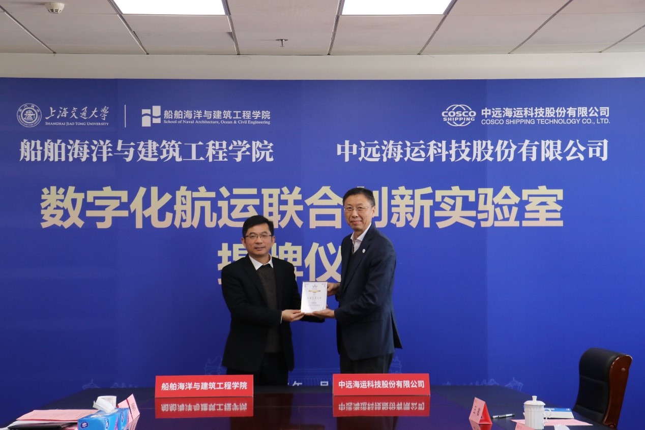 王新波、周薇代表双方签署“数字化航运联合创新实验室”共建协议,并为联合创新实验室揭牌。