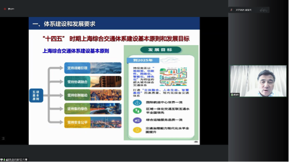 讲座的第四部分,戴晓坚介绍了上海综合交通建设新时期发展定位。他强调:“十四五”时期是上海加快建设具有世界影响力的社会主义现代化国际大都市的关键时期。上海的综合交通体系建设对接更高发展要求,主要表现:一是要积极贯彻交通强国建设的战略要求;二是积极贯彻长三角更高质量一体化发展要求;三是积极贯彻提升社会治理现代化水平要求;四是积极贯彻建设人民城市的发展要求;五是积极贯彻生态文明建设和碳达峰、碳中和要求;六是积极贯彻城市数字化转型发展要求。上海立足于完善以“枢纽型、功能性、网络化、智能化、绿色化”为特征的超大城市综合交通体系,坚持强枢纽、织网络、提品质、优治理促转型的总体思路。