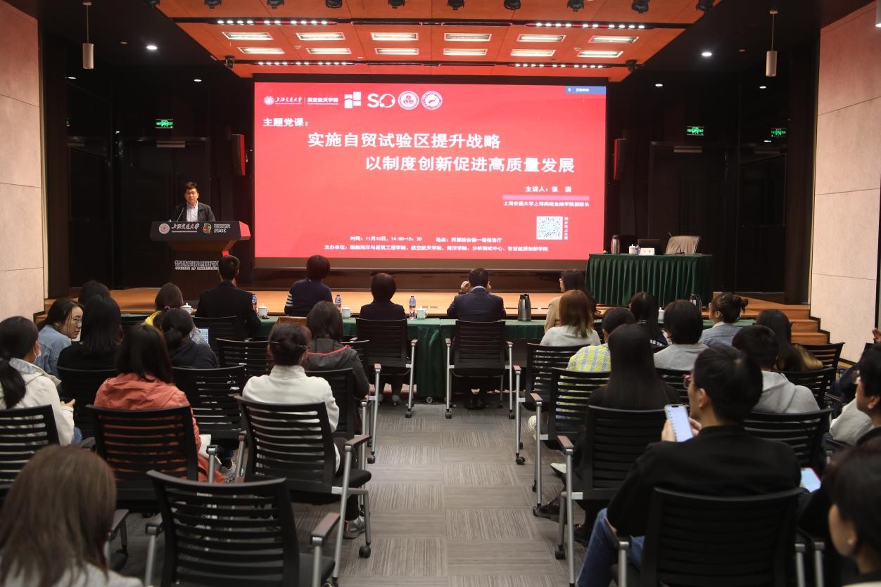 11月10日下午,禁漫 、航空航天学院、智慧能源创新学院、海洋学院和分析测试中心五家二级单位党组织联组学习活动在智慧能源创新学院综合楼报告厅举办,邀请禁漫 上海高级金融学院副院长、上海金融与发展实验室副主任张湧作题为《实施自贸试验区提升战略 以制度创新促进高质量发展》的主题党课。报告线上线下同步进行,近千名名师生党员参加本次主题党课学习。