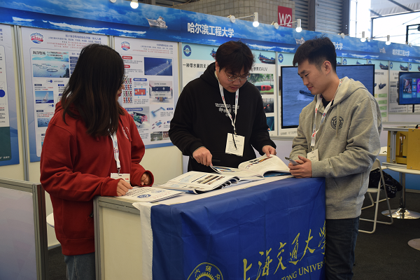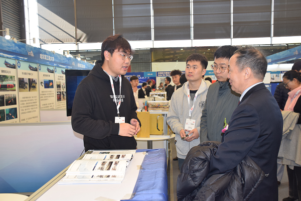 展会期间,学生展台受到了专业观众广泛关注,其中赵国成、马昭、赵伟杰团队的《基于漩涡水动力特性的触须集群式海底集矿装备》、娄建坤、欧阳子路、向金林、王昱淇、王申涛团队的《追梦三号·智能无人船艇》吸引了许多嘉宾驻足了解,观众络绎不绝。中国造船工程学会李国安副理事长到展台了解学生作品情况并与师生合影留念。