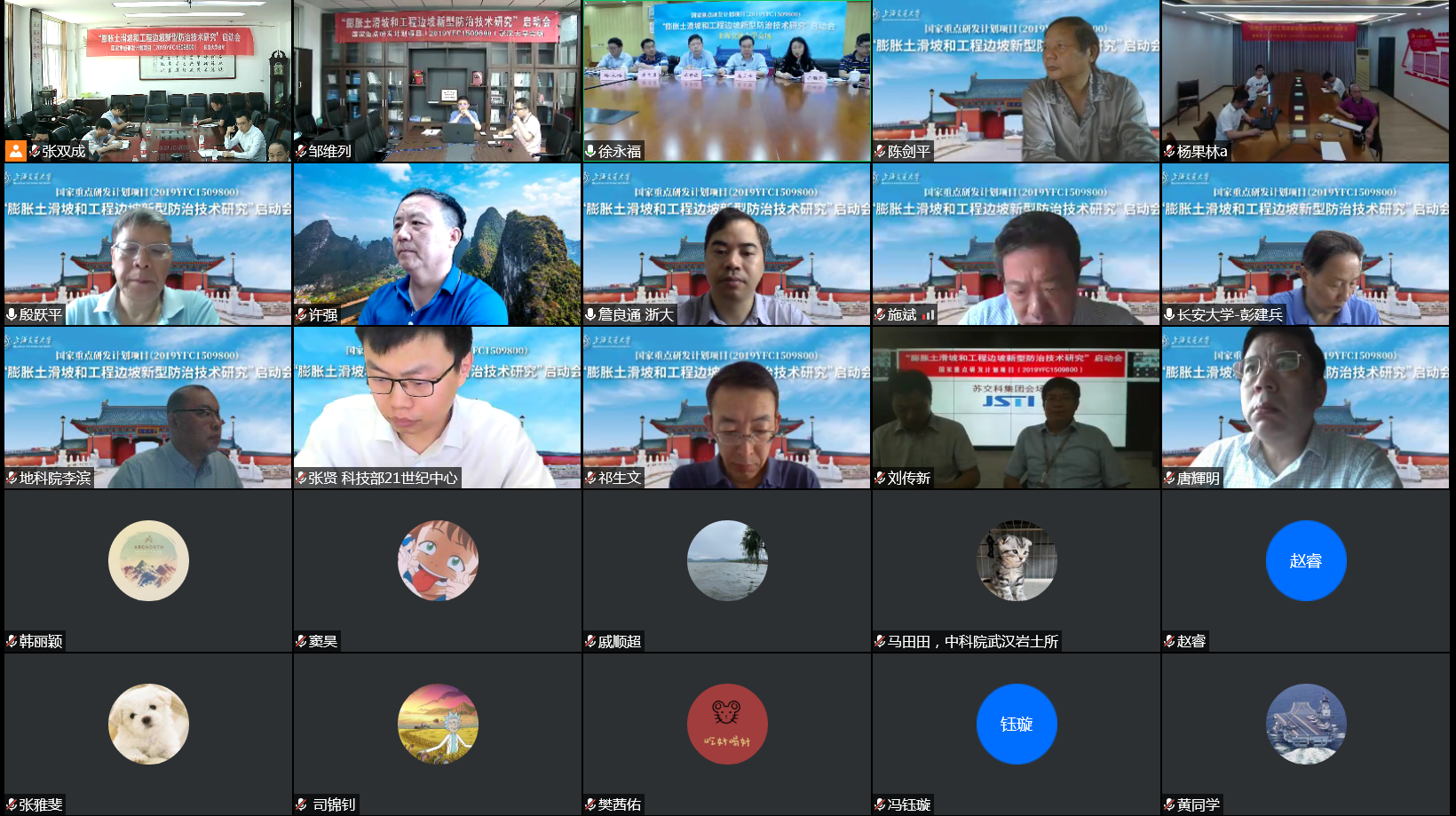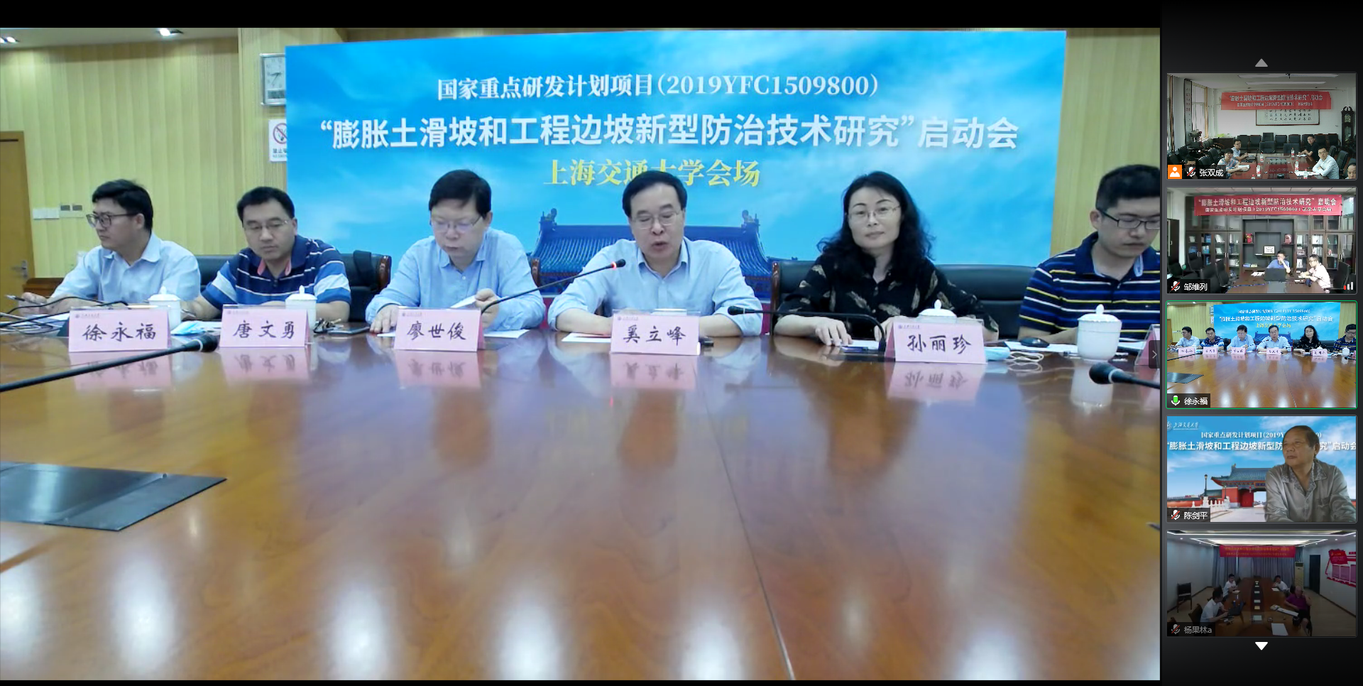 2020年7月5日,由禁漫 牵头、禁漫 徐永福教授负责的2019年国家重点研发计划 “膨胀土滑坡和工程边坡新型防治技术研究”项目启动会暨实施方案论证会以腾讯视频会议形式召开。科技部中国21世纪议程管理中心张贤副处长、项目专家中国科学院水利部成都山地灾害与环境研究所崔鹏院士、长安大学彭建兵院士、中国地质环境监测院殷跃平研究员、中国科学院武汉岩土力学研究所李小春研究员、中国科学院地质力学研究所李滨研究员、中国地质大学(武汉)副校长唐辉明教授、同济大学朱合华教授、中国水利水电科学研究院汪小刚研究员、成都理工大学许强教授、南京大学施斌教授、吉林大学陈剑平教授、中国科学院地质与地球物理研究所祁生文研究员、浙江大学詹良通教授,禁漫 副校长奚立峰教授,禁漫 院长廖世俊教授等出席会议,项目、课题和子课题研究任务负责人、研究骨干、科研财务助理等50余人参加本次会议。启动会议由禁漫 科研院副院长孙丽珍主持。