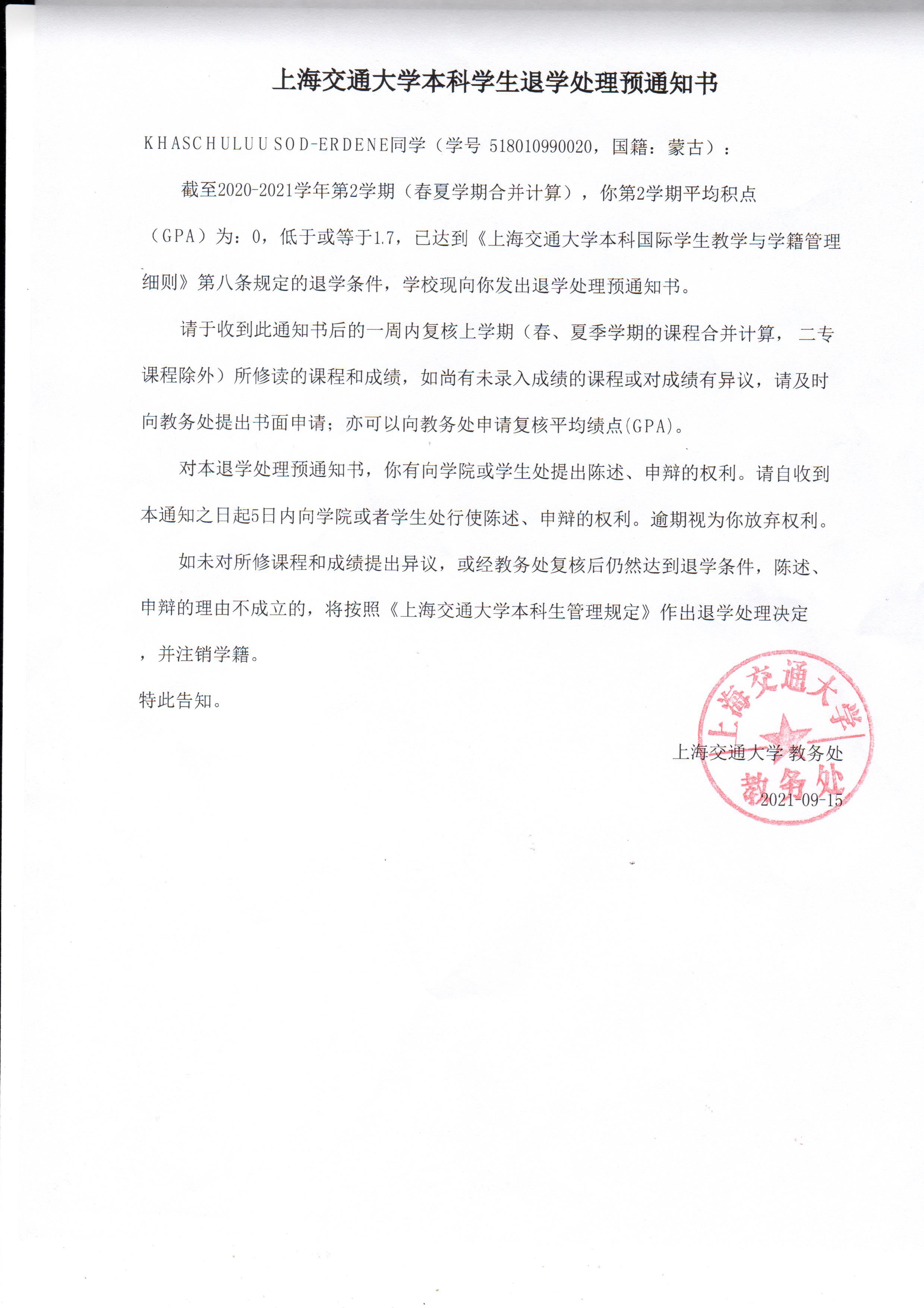 截至2020-2021学年第2学期(春夏学期合并计算),你第2学期平均积点(GPA)为:0,低于或等于1.7,已达到《禁漫 本科国际学生教学与学籍管理细则》第八条规定的退学条件,学院现向你发出退学处理预通知书。