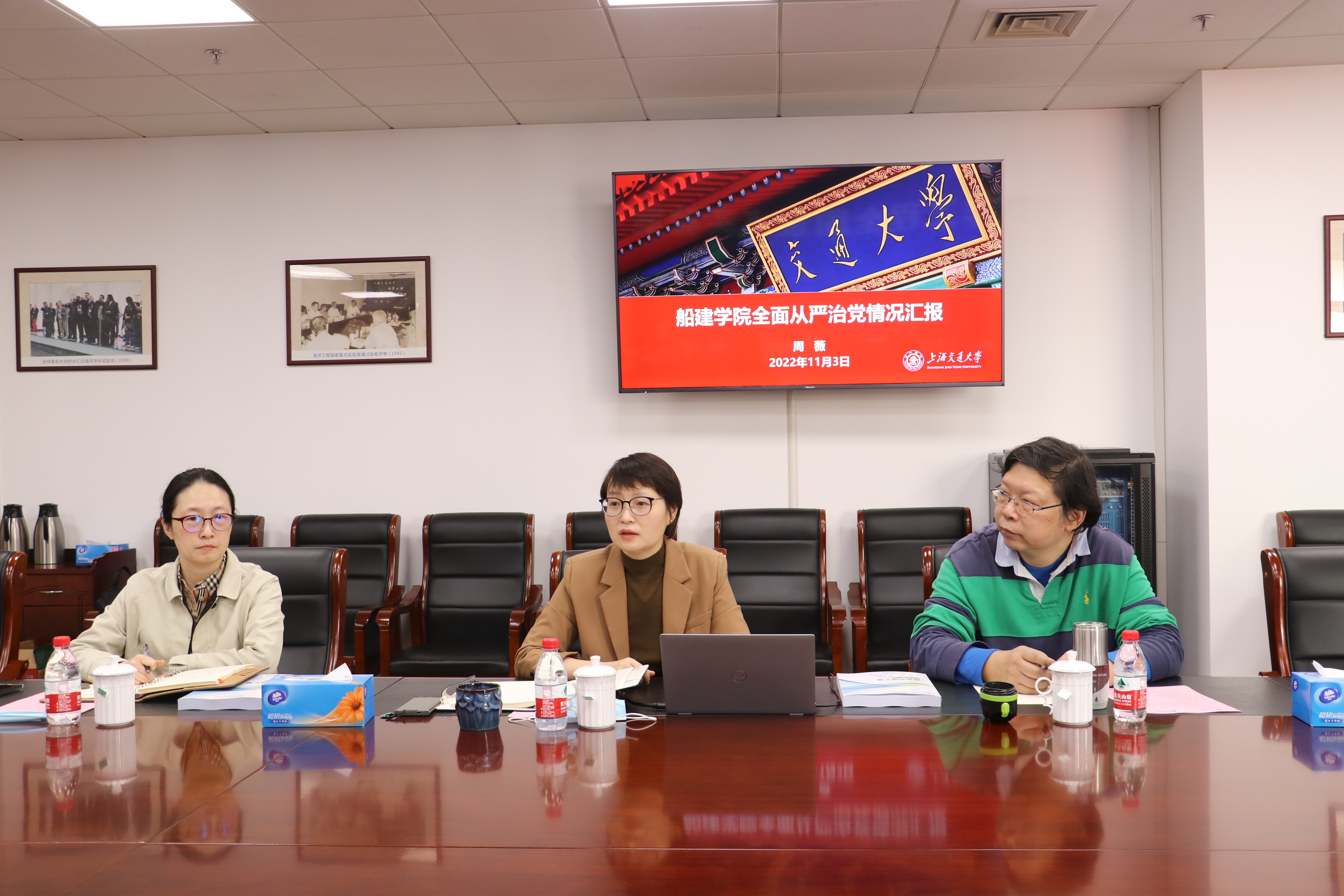 周薇代表学院欢迎周承书记一行,并进行工作汇报。周薇从学习宣传贯彻党的二十大精神、党内廉政建设和党内监督工作重点任务落实、学院疫情防控工作落实、学院科研经费管理机制等四个方面汇报了学院落实全面从严治党的开展情况。