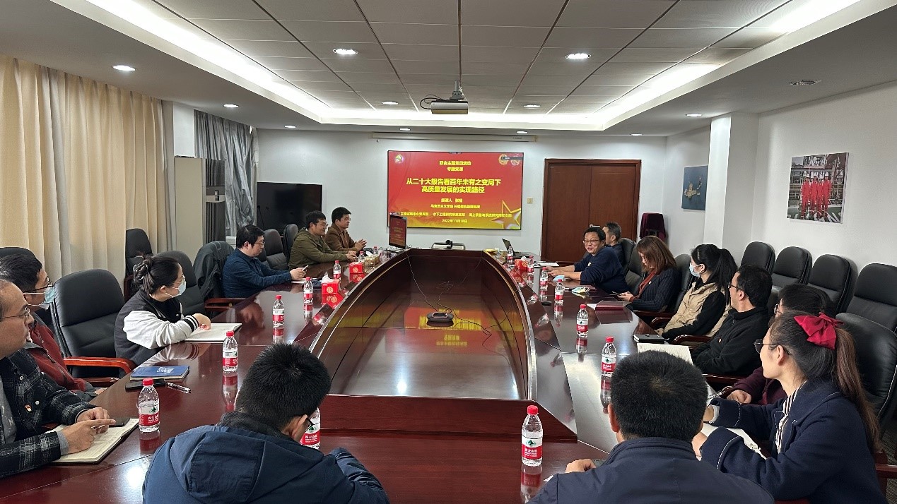 2022年11月18日,为深入学习、深刻领悟习近平总书记二十大报告精神,船海工程试验中心党支部、水下工程研究所党支部和海上装备与系统研究所党支部在海洋深水试验池五楼会议室开展了联合主题党日活动,邀请马克思主义学院助理教授张杨老师为支部党员讲授题为《从二十大报告看百年未有之变局下高质量发展的实现路径》的专题党课。学习活动由船海工程试验中心党支部书记李俊主持,共有30余名党员参加。