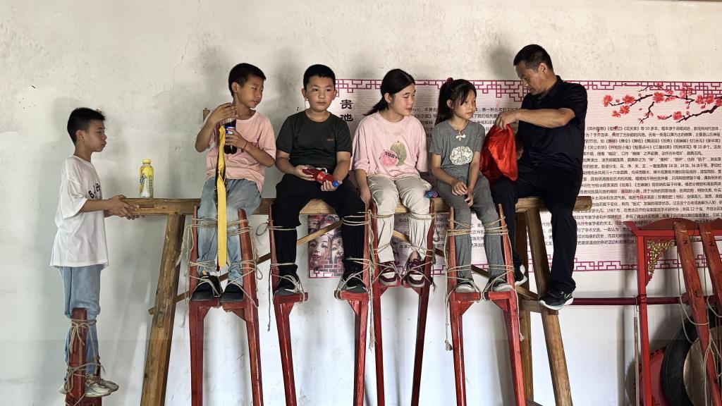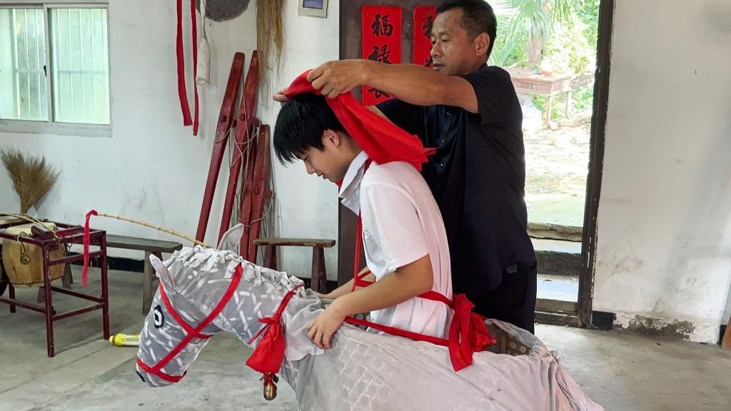 实践队前往傩戏协会,观摩杜胜进会长指导少年传承人训练傩戏曲目,老艺人的坚守与少年的朝气交融,一招一式间展现家族传承的“代际接力”。在杜会长的邀请下,团队成员深度体验了傩戏表演中的踹竹马,通过切身体验,更深刻认识到家族传承对傩戏的“活态延续”。