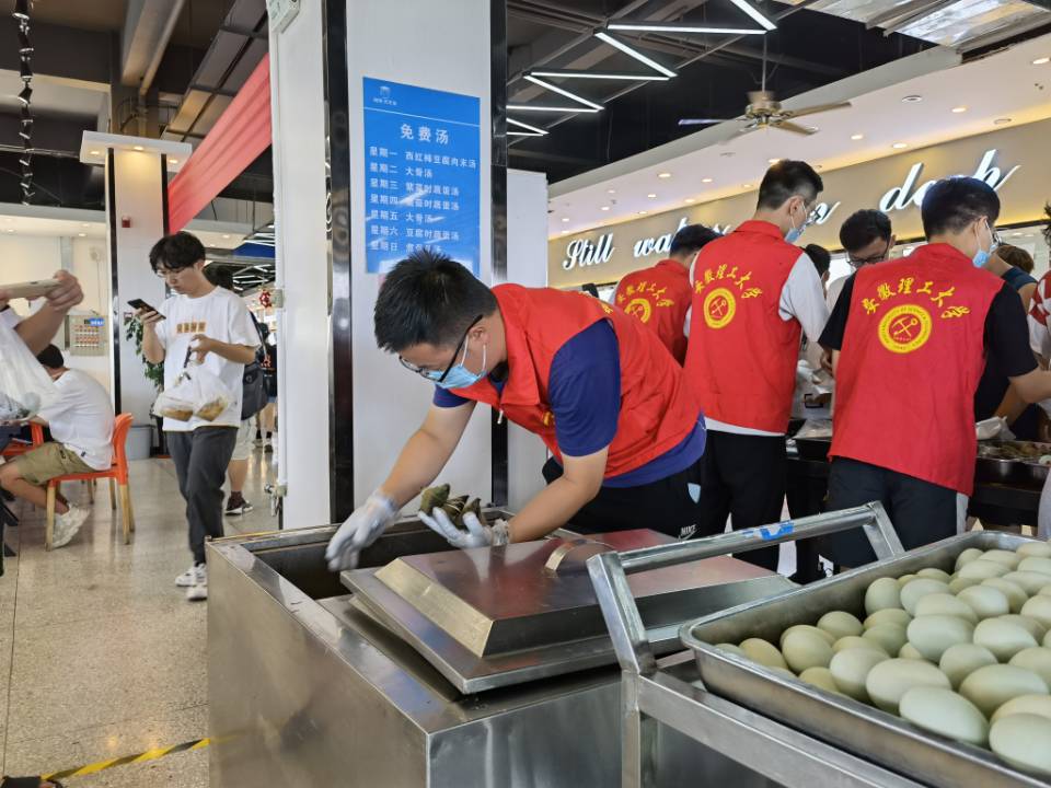 学生党支部开展党员志愿者食堂帮扶活动。毕业生党员统一穿着志愿者红马甲,在义苑食堂就餐大厅参与服务工作。他们不畏炎热天气,在收残柜台收拾碗盘,清洁桌椅和地面等,并引导师生遵守食堂秩序,文明就餐。在就餐高峰期间,他们提醒师生间隔就坐,落实光盘行动,展现了“我为群众办实事”的党员风采。