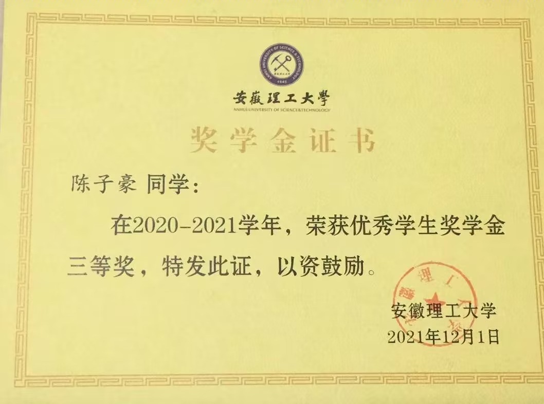 陈子豪,光电信息19-1团支书,中共党员,校奖学金获得者,三好学生,优秀共青团干部。考研录取合肥工业大学光学工程专业。