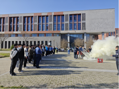 疏散演练后,彭广峰向大家详细讲解了灭火器的使用方法和注意事项,并现场指导师生代表亲自操作。