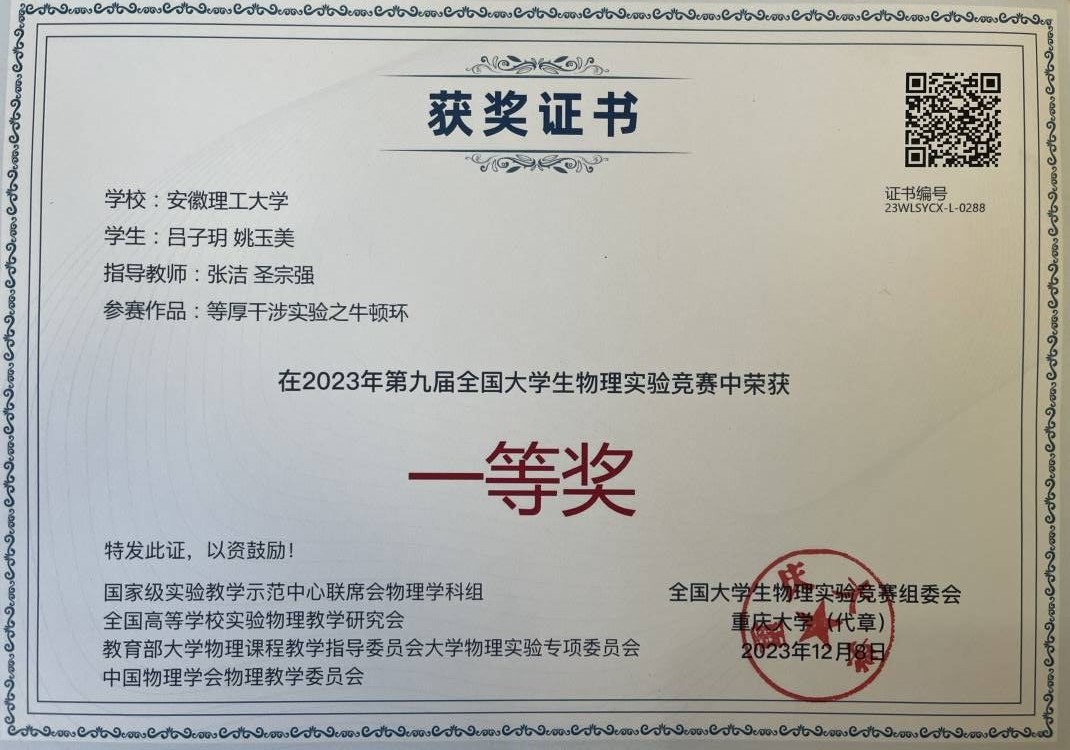 2022级光电信息科学与工程专业本科生姚玉美、吕子玥同学荣获一等奖,取得我校迄今在该项赛事中最佳成绩。
