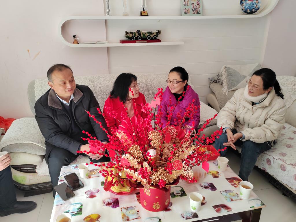 在现役军属、基础力学系教师崔智丽家中,副院长(主持工作)圣宗强等与其亲切交谈,对军属家庭长期以来为祖国国防建设和学校发展所做出的积极贡献表示感谢,并关切询问了军属们的家庭生活情况和存在的困难,并献上节日的祝福和问候。