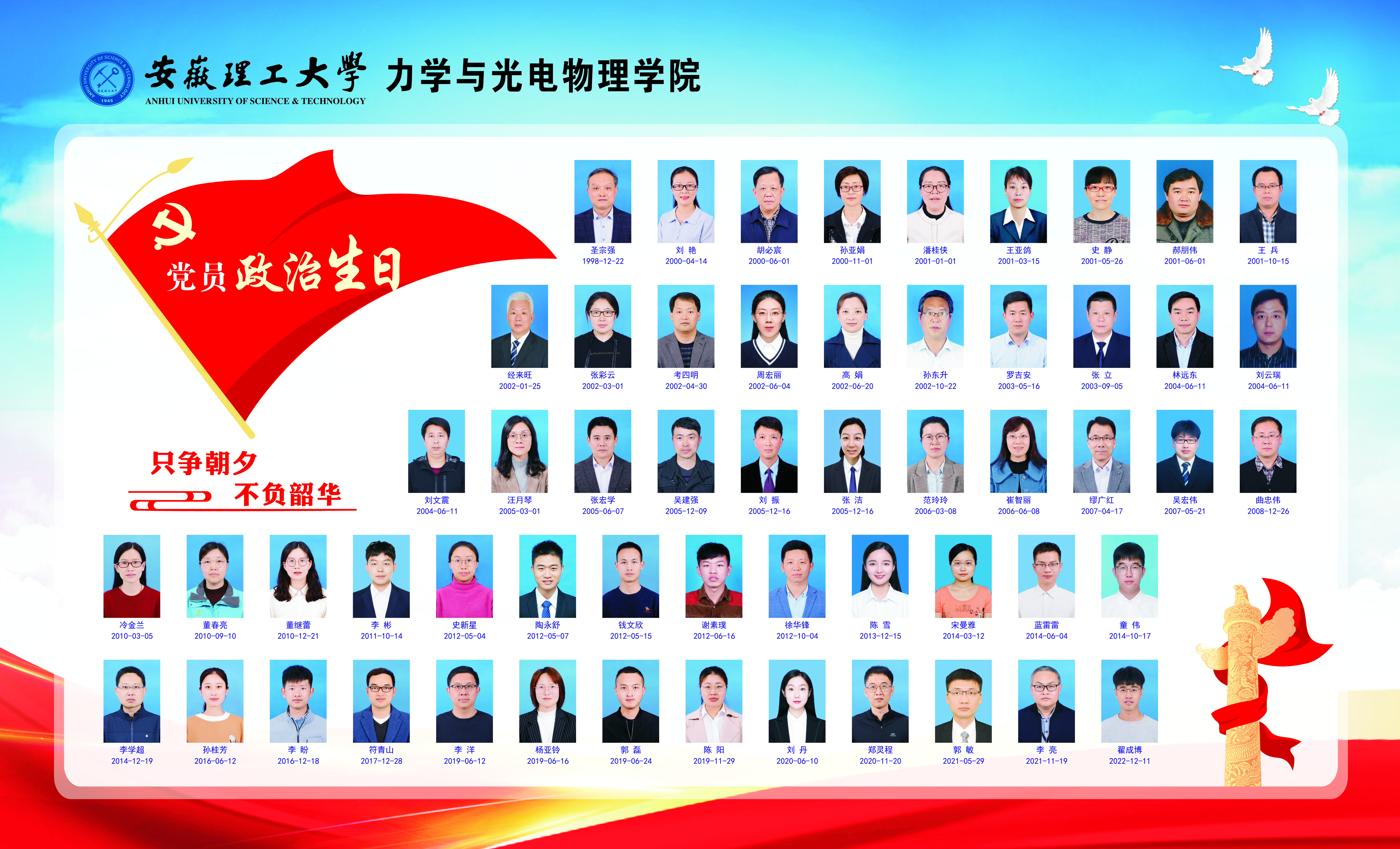 56名在职教工党员的照片、姓名、入党时间赫然显示其上,党旗高高飘扬,党徽熠熠生辉,汇聚成“只争朝夕、不负韶华”的党员力量。