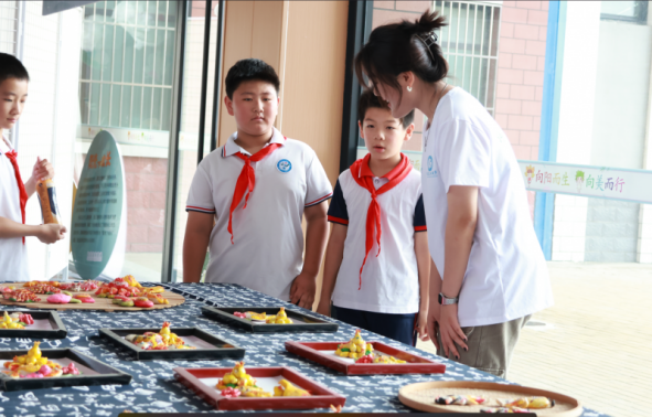 团队成员带领小朋友们参观“郎庄面塑”的手艺,“郎庄面塑”用精麦面粉发面,发好后用捏、揉、粘等方法塑造出各种花样,然后蒸熟,上胶绘色,晒干即成。小朋友们用面粉捏造出各种卡通图案,传承非遗文化,体验非遗魅力。