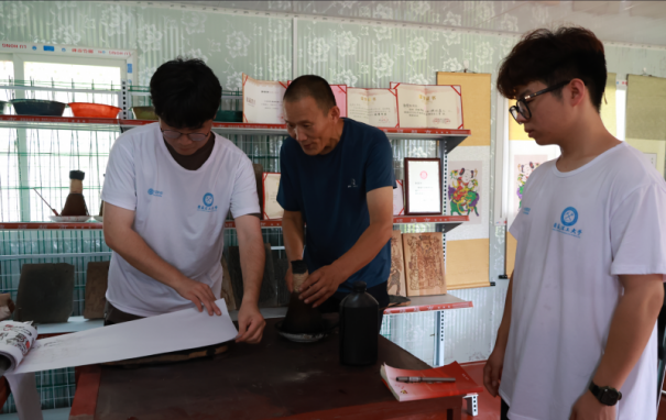 8月2日,团队成员来到聊城市道口铺和黄寨子,拜访了国家级非物质文化遗产“东昌府木版年画”的传承人郭春奎老师、郭贵阳老师,通过与二位老师交谈,团队成员了解了木版年画的历史沿革,选木、浸沤、阴干、绘制、粘贴、雕版、套印等制作工艺,同时也了解到目前木版画传承所面临的困境。