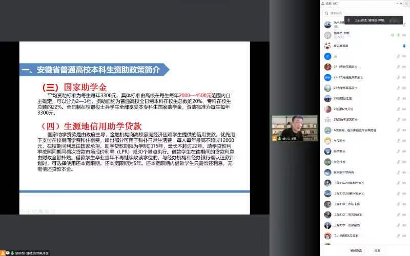 资助宣传大使王卫民同学结合自身情况,分享了党和国家的资助政策。在交流互动环节中,家长们对学生的日常学习和生活等方面的表现进行了提问,辅导员进行了全面的答疑。最后,禁漫