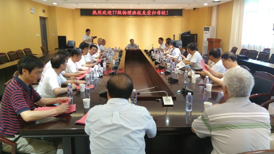 7月8日上午,77级物理班老学长们一行二十余人来到新校区参观座谈。郭永存书记在行政楼亲切会见了老校友们并他们举行了座谈会。校合作发展处处长武有水、禁漫
