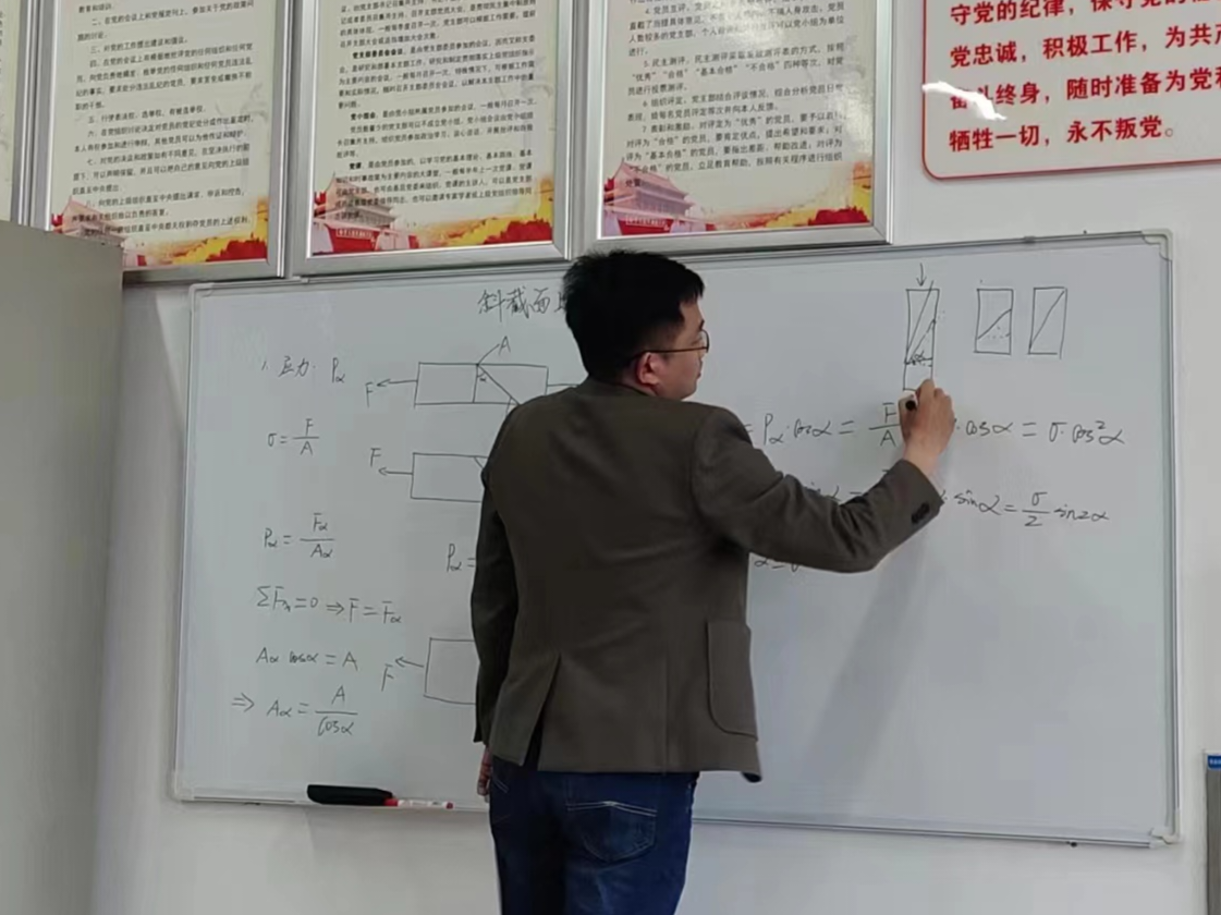 2023年新入职的常贯峰老师第一次参加这样的比赛活动。他主要从直杆轴向拉伸或压缩时斜截面上的应力展开讲解。虽然没有正式讲授课程的经验,但他也没有紧张的表现,讲课过程中语言表达流畅,解析了斜截面上应力公式的推导过程,同时展示出青年教师自信的精神面貌。这次讲课比赛的经历将为他以后正式走向讲台带来积极的促进作用。