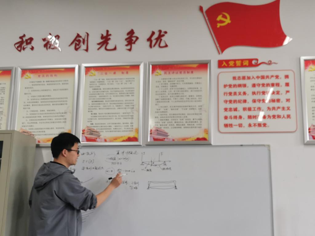 2021年入职的童伟老师,已经具有一定的教学经验。他围绕弯曲应力展开分析,在板书中立体动态的展现了微元体的受力特征,详细演示了弯曲正应力的推导过程,讲课过程中表述问题清晰、逻辑关系紧密,讲课过程中图文并茂、挥洒自如、跃然纸上,彰显了青年教师敏捷的思维和青春的活力。
