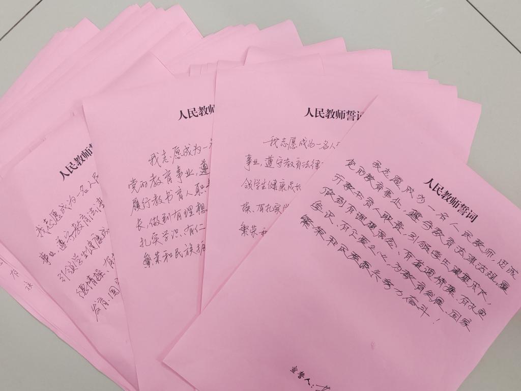 硬笔书法比赛分为规定内容和自选内容两个部分,其中“人民教师誓词”作为书写的规定内容。比赛现场,教师们各显身手,聚精会神,将身心融于笔端,所写作品或有劲大气,或飘逸潇洒,或娟秀玲珑,充分展现了禁漫