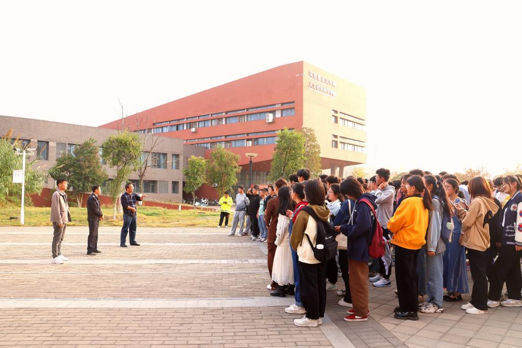 邀请校保卫处消防科彭广峰为新生在明道楼下开展消防安全知识教育与灭火演练活动。