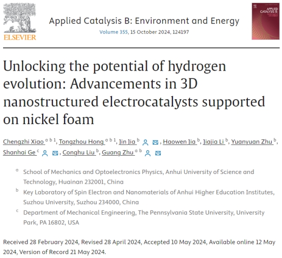 光电系统与控制专业2022级光电系统与控制专业硕士研究生肖诚志以第一作者身份、2023级光电系统与控制专业硕士研究生洪铜洲以共同第一作者身份在环境能源领域国际顶级期刊《Applied Catalysis B: Environment and Energy》发表题为《Unlocking the potential of hydrogen evolution: Advancements in 3D nanostructured electrocatalysts supported on nickel foam》的论文,探讨镍泡沫负载纳米结构电催化剂的研究进展及其展望。论文以宿州禁漫