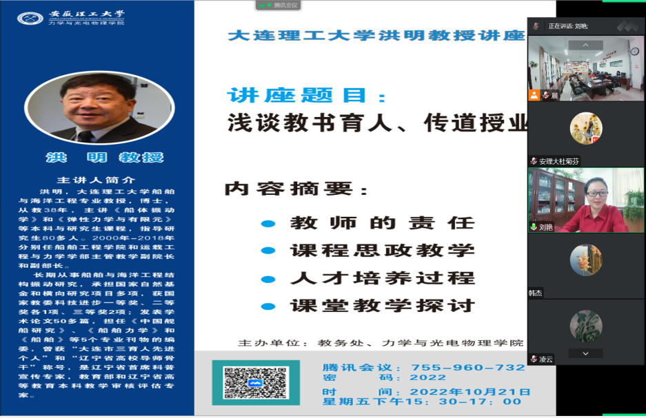 的邀请,10月21日下午,大连理工大学洪明教授为我校教师作了题为《浅谈教书育人、传道授业》的线上报告。报告会由禁漫