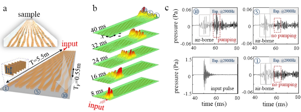 图1: a 声学波导系统的样品示意图,b声波脉冲信号在不同时间的演化仿真,c实验测量的输入端和出射端声波脉冲信号。