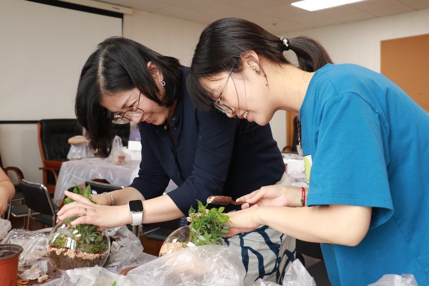为舒缓学院女性教职工心理压力,点缀办公工位环境,7月24日, 相约木兰,细赏微观桌面盆栽制作活动在木兰楼十楼举办。活动吸引六十余名女性教职工报名参与。院工会主席刘铸永出席本次活动,活动由妇女委员曹嘉...