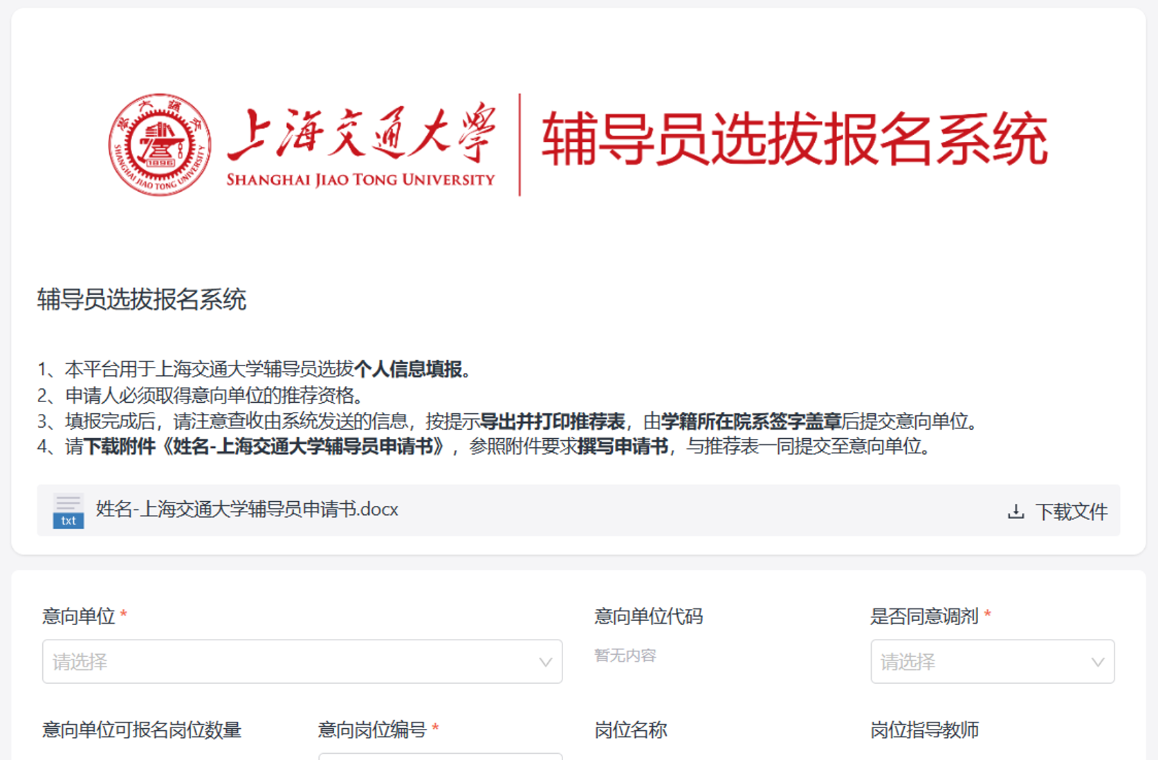 2. 5月8日12:00前,申请人登录“禁漫 辅导员选拔报名系统”,选择设岗单位(禁漫 )和意向岗位编号报名。报名前申请人需征得研究生导师/本科毕设导师同意。报名时严格按照格式要求填写,学生获奖情况需与证明材料一一对应。报名材料经格式初审通过之后可导出PDF版辅导员推荐表。