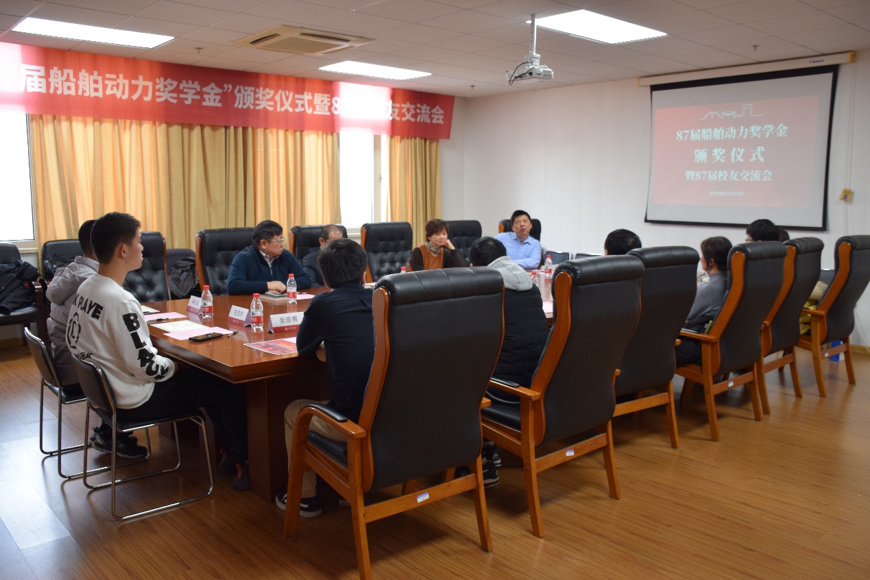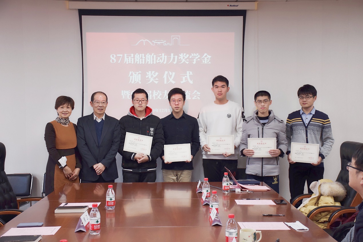12月19日下午,禁漫 87届船舶动力奖学金颁奖仪式在木兰船建大楼A1006会议室举行。87届校友代表陈涛学长、黄建新学长、黄卫学姐、张嘉庆学长,禁漫 党委副书记宋续明,船舶与海洋工程系副系主任陈俐,以及2020年度船舶动力奖学金的5位获奖学生出席仪式。仪式由学院学生事务负责人史舒婧主持。