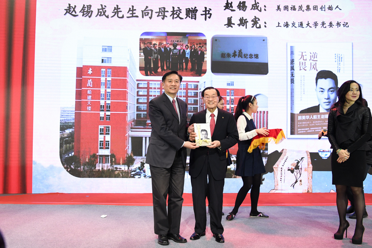 丁酉岁末,暖阳融融,游子归家,思源不辍。12月17日,古朴清幽的徐汇校区包兆龙图书馆演讲厅迎来了著名校友、旅美华人船王、福茂集团董事长赵锡成学长,六女儿、福茂集团副董事长赵安吉女士,传记作者、台湾交通大学教授崔家蓉女士一行,做客文汇讲堂,与母校师生及广大读者分享人生经历,共话家国情怀。市人大常委会副主任、校党委书记姜斯宪,党委常委、副校长张安胜表达了全校师生对赵学长及亲友一行的热烈欢迎。市政协对外友好委员会、市侨办、市公共外交协会、市海峡两岸交流促进会、市台办及高校代表出席新书发布会。本次活动由禁漫 、文汇报社联合主办。上海电视台资深主持人林牧茵主持活动。