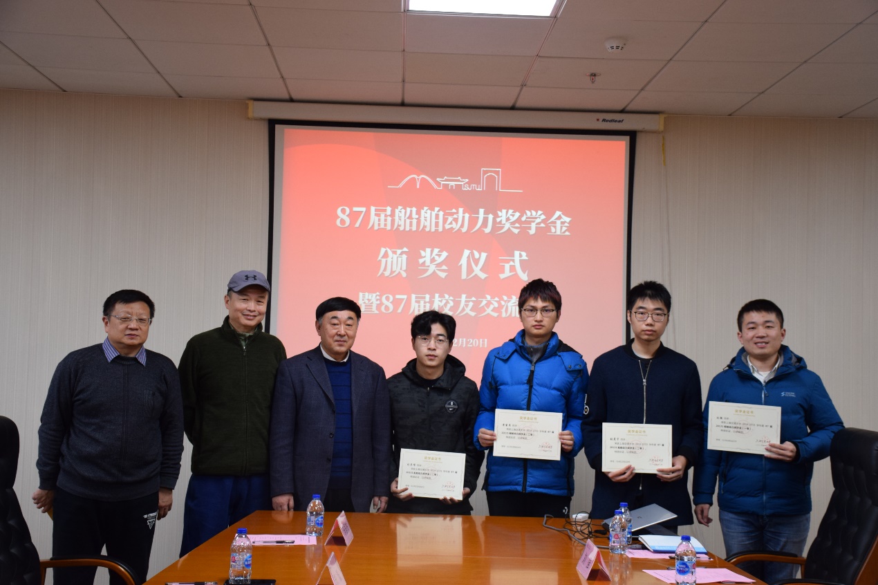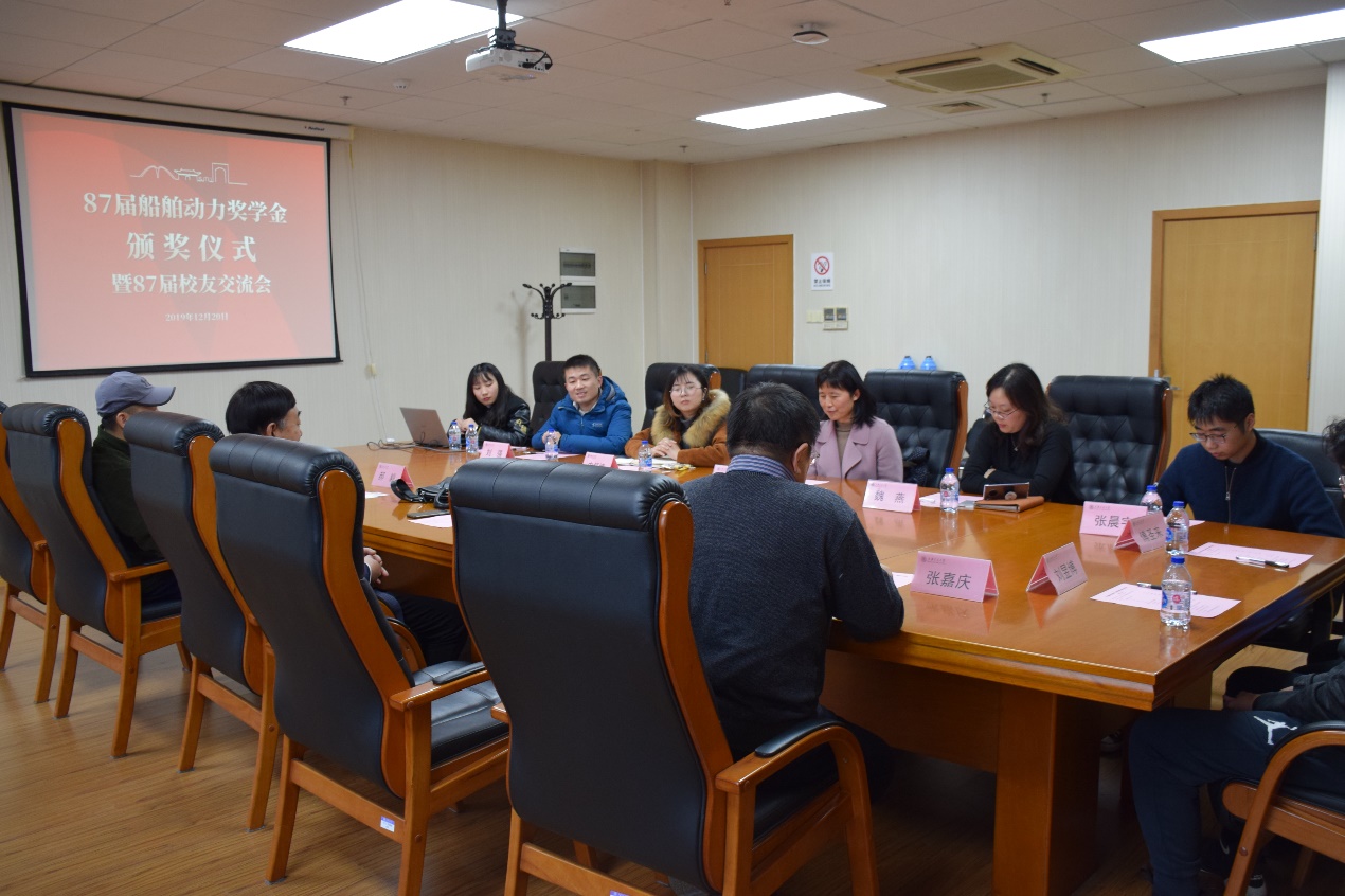 12月20日下午,禁漫 87届20131船舶动力奖学金颁奖仪式在木兰船建大楼A1008会议室举行。87届校友牟广文学长,郝毅学长,张翠熙学姐,乐国杰学长,张嘉庆学长,禁漫 党委副书记宋续明,船舶与海洋工程系副系主任陈俐,校友工作联系人魏燕,学生事务负责人史舒婧,船建学工办辅导员邹碧铖,2019年度船舶动力奖学金4位获奖学生出席仪式。