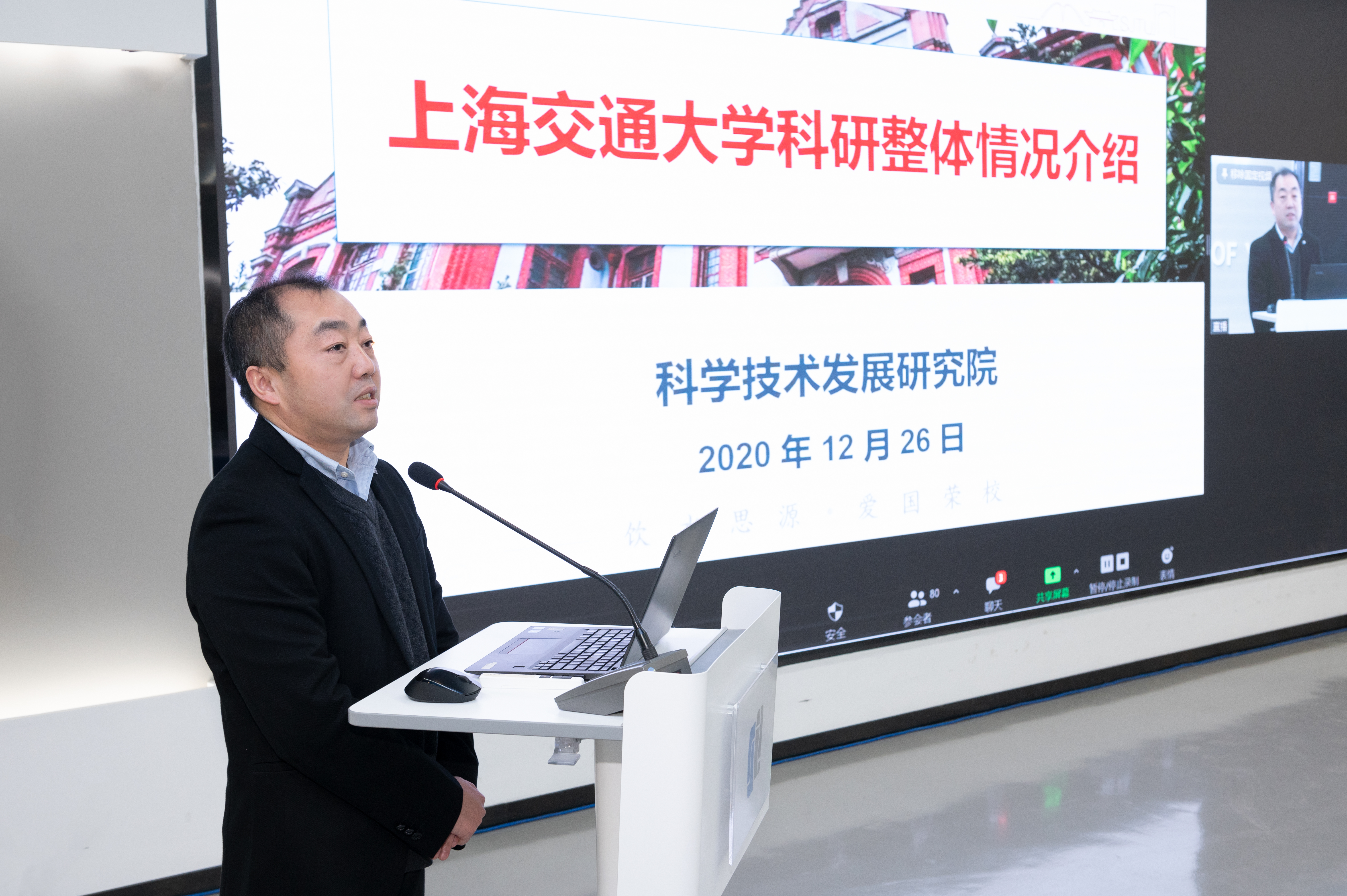 曾小勤作学校科研政策讲解,从交大的创建历史出发,介绍了学校在科研成果、科研政策等方面的现状,全方位、多角度的呈现了交大在科研方面的优势和交大人上下求索的精神。他表示,交大将全力为青年学者们提供利于研究的学术科研环境,期待各位青年人才来校开展前沿科学研究。