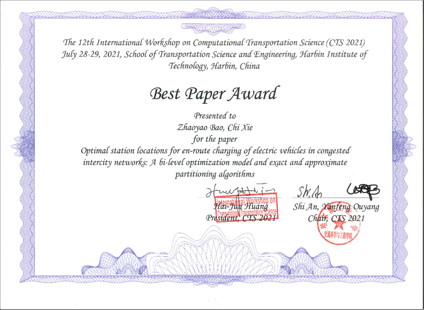 在此次大会上,由禁漫 交通运输工程系博士生鲍照耀及其导师谢驰教授(目前为同济大学交通运输工程学院与城市交通研究院教授)共同撰写的学术论文:“Optimal Station Locations for En-Route Charging of Electric Vehicles in Congested Intercity Networks: A Bi-Level Optimization Model and Exact and Approximate Partitioning Algorithms”,经过专家的通讯评审和会议评审,从七十多篇投稿论文中脱颖而出,荣获大会“最佳论文奖”(Best Paper Award)。该论文以国家新基建战略下的重大需求为目标,为城际高速公路中电动汽车充电设施选址问题创造性地提出了一个新型双层选址优化模型,设计了基于分区原理的精确和启发式组合优化高效求解算法,并利用长三角高速公路网络对模型与算法进行了测试和分析。