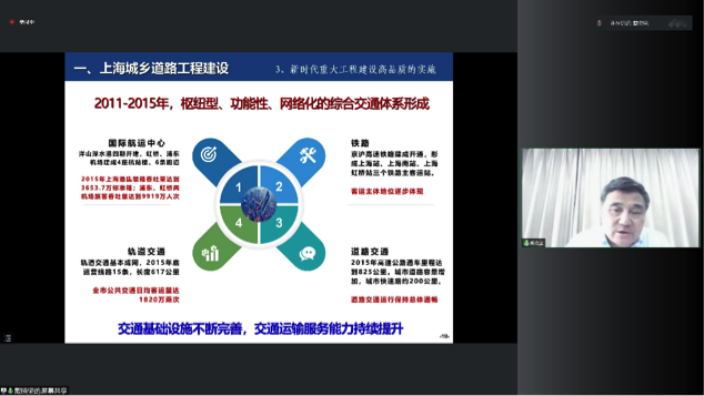戴晓坚从道路、航运(航空、海运)、轨道交通、铁路四个方面梳理并讲述了上海交通基础设施的建设发展状况。他指出,1843年开埠后至20世纪初,上海租界地区路网骨架形成,但解放前,上海交通整体呈现“局部有序、全局无序”的畸形局面。解放后,20世纪50年代,上海掀起一场“造路运动”;20世纪70年代,越江通道迈出“零”的突破。改革开放以后,上海交通建设实现跨越式发展,到了20世纪90年代,初步形成立体化的市内交通体系,并向注重与城市环境相协调、提升综合功能方面转变。直到今天,上海已经形成了枢纽型、功能性、网络化的综合交通体系,交通基础设施不断完善,交通运输服务能力持续提升。