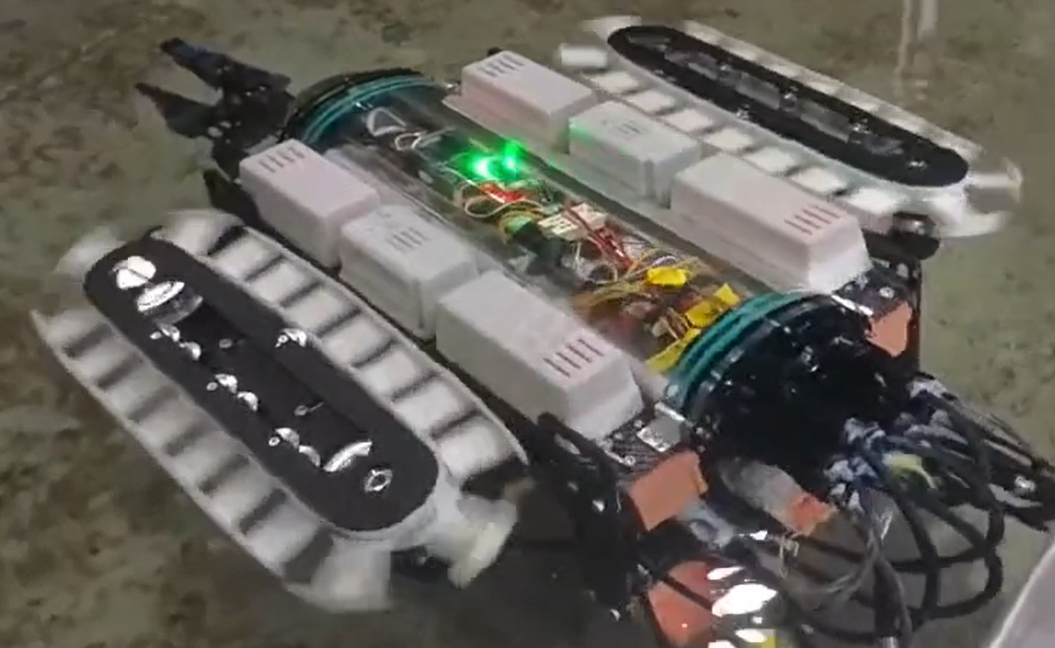 团队携自主研发的样机惊艳亮相,首次将增强现实(AR)技术深度应用于项目成果展示环节,为观众带来一场融合科技感与视觉冲击的沉浸式体验。AR技术精准还原并动态呈现了该项目五大核心功能状态:爆炸拆装、水下爬行、模态切换、水面游动、水中识别抓取。通过AR交互模式,可直观“目睹”样机在不同环境下的运行逻辑与技术细节。