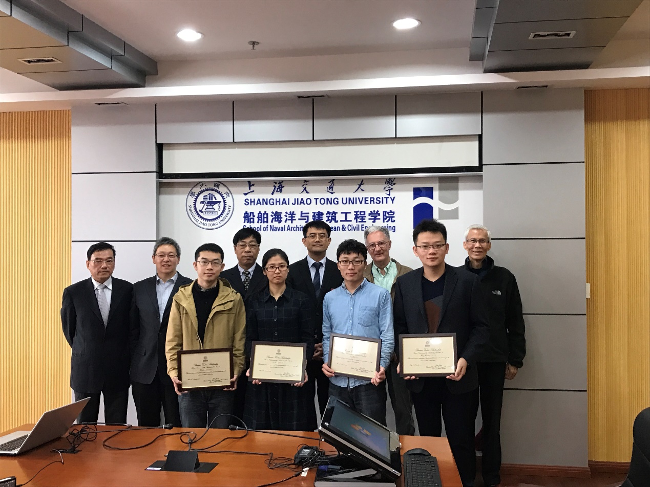 杨建军宣读获奖同学名单,与会嘉宾为获得奖学金的硕士、博士共计4名学生颁奖。随后,获奖学生分别介绍了自己的学习情况和课题进展。法国船级社两位嘉宾也与同学们分享了各自的研究领域和工程经验,就同学们的论文课题进行了深入的探讨,并介绍了法国船级社内与同学们课题相关的部门现状。获奖同学还就职业选择和未来发展等方面提出了不少大家关心的问题。嘉宾们纷纷表示,未来的发展方向还是要根据个人的兴趣和专业特长来考虑,目前在船舶行业内有不少不错的企业,希望大家能做出适合自己的选择,并表示非常欢迎交大优秀学子能够加入法国船级社。