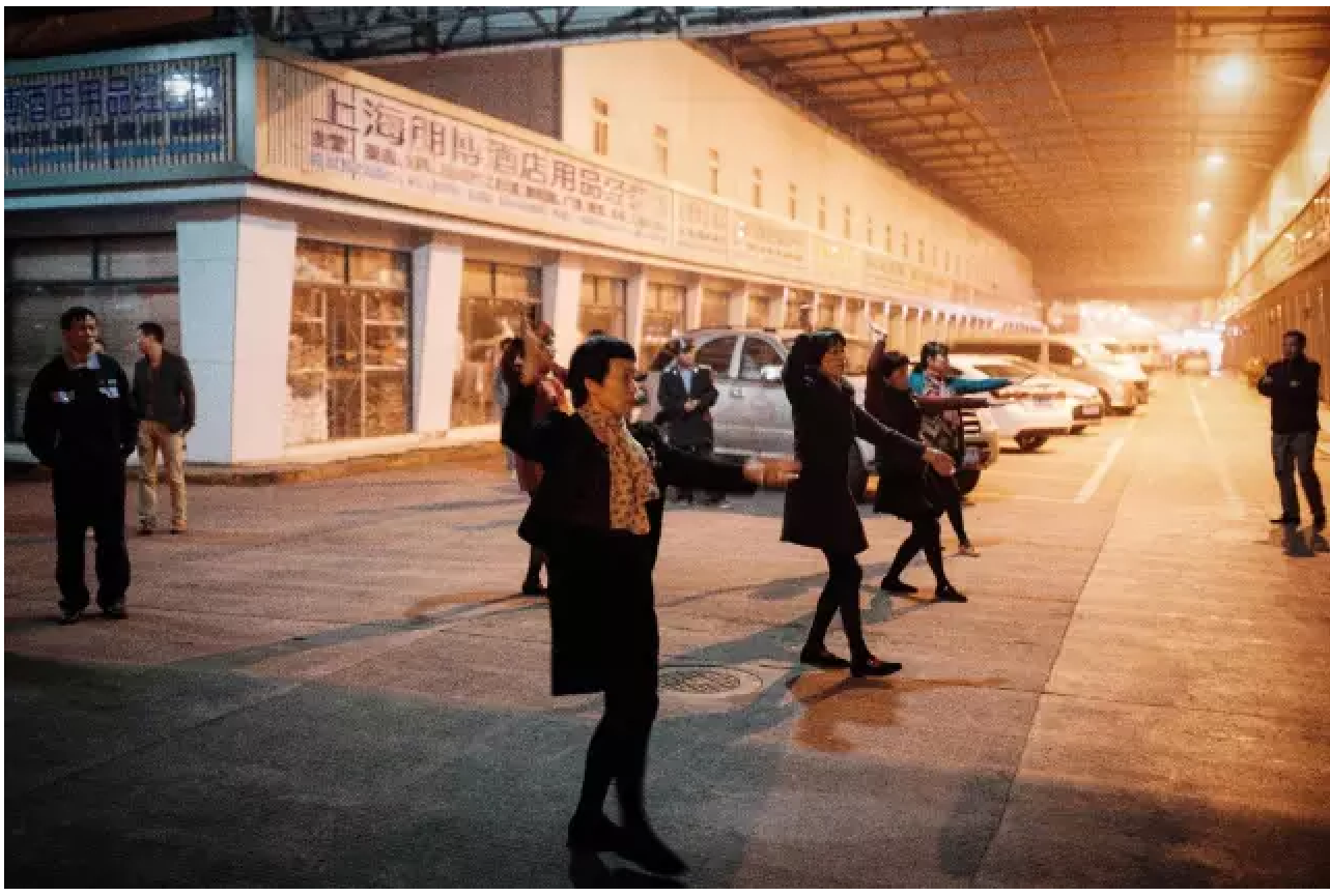 九星市场白天熙熙攘攘的商业街,晚上成为阿姨们跳舞的广场。为经济利益加建的雨棚成为阿姨们音响的回声板,阿姨们把音箱架在雨棚高处,使声音格外有质感。