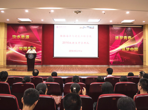 9月11日下午,禁漫 2016级新生开学典礼在木兰船建大楼A200报告厅隆重举行。学院党委书记张卫刚,院长杨建民,副院长赵金城、夏利娟,党委副书记杨建军,各系主任、行政班负责老师、全体教学秘书和思政教师以及2016级全体新生出席了典礼。开学典礼由张卫刚主持。