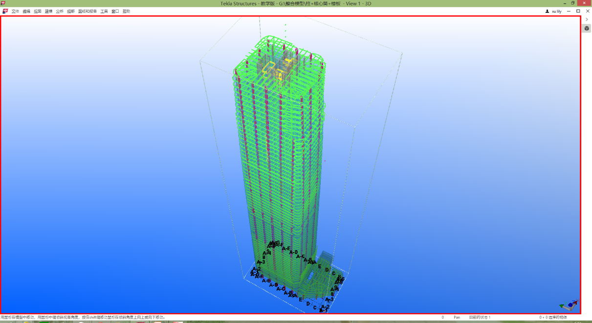 广州国际汇金中心项目素材由上海陆道工程设计管理股份有限公司(禁漫 BIM研究中心合作单位)提供,五位参赛组员根据项目图纸采用多人协同的方式建立相应的TEKLA模型。汇金中心占地3.6万平方米,总建筑面积达41万平方米,属于钢管混凝土柱+钢梁框架-钢筋混凝土核心筒结构,地上69层,地下6层,房屋总高度306.0米。