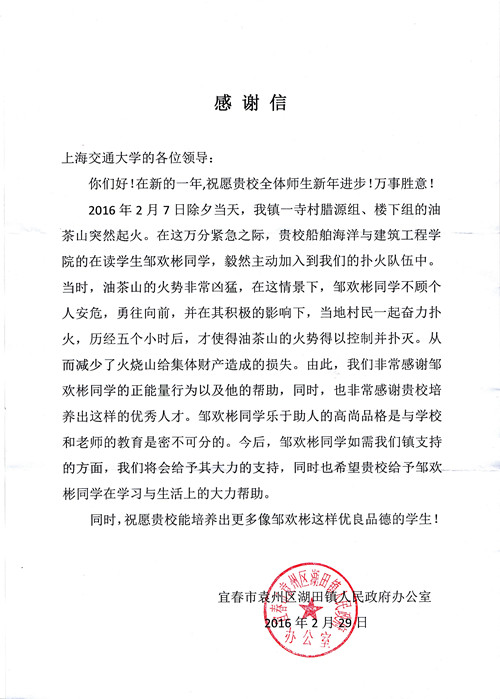 2月7日除夕当天,江西省宜春市湖田镇油茶山突发火情。火势凶猛,蔓延迅速,情况非常危急。路过该处的禁漫 2015级本科生邹欢彬奋勇上前,主动加入救火队伍,历经五小时与山火的搏斗,终于控制火势并扑灭,减少了山火对集体财产造成的损失。 3月下旬,湖田镇人民政府办公室寄来感谢信,向邹欢彬的英勇行为表示了衷心的感谢。